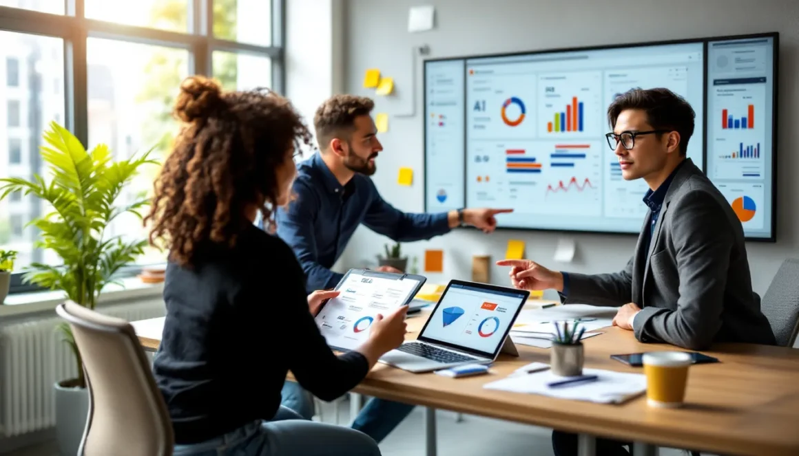 Marketer in a modern office comparing AI marketing dashboards to choose the best tools.